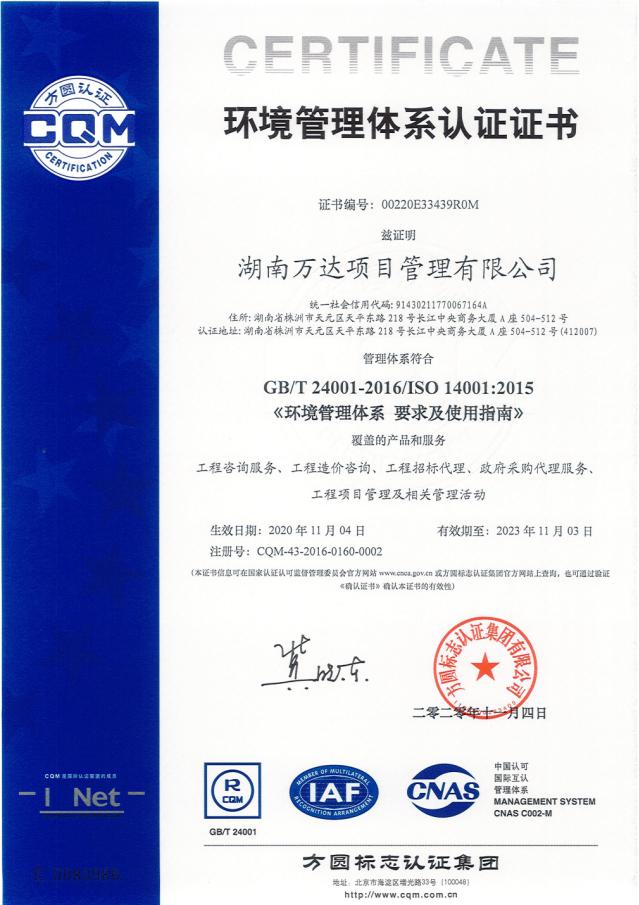 环境管理体系认证证书